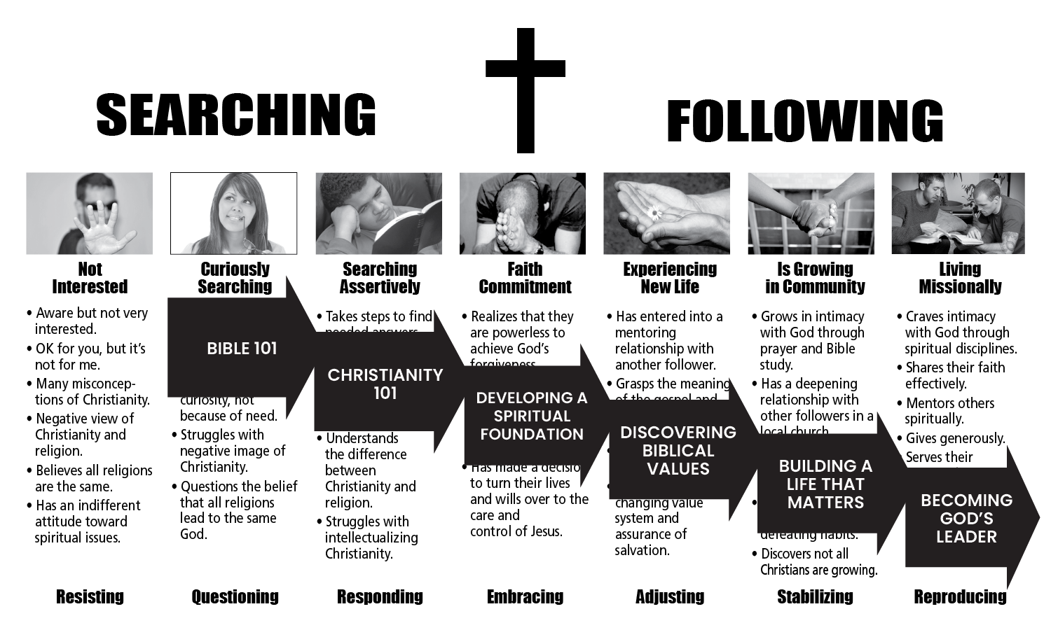 The process starts off with a spiritual assessment through the Spiritual Journey Guide where a follower of Christ helps develop a personalized plan towards spiritual discover or spiritual maturity.